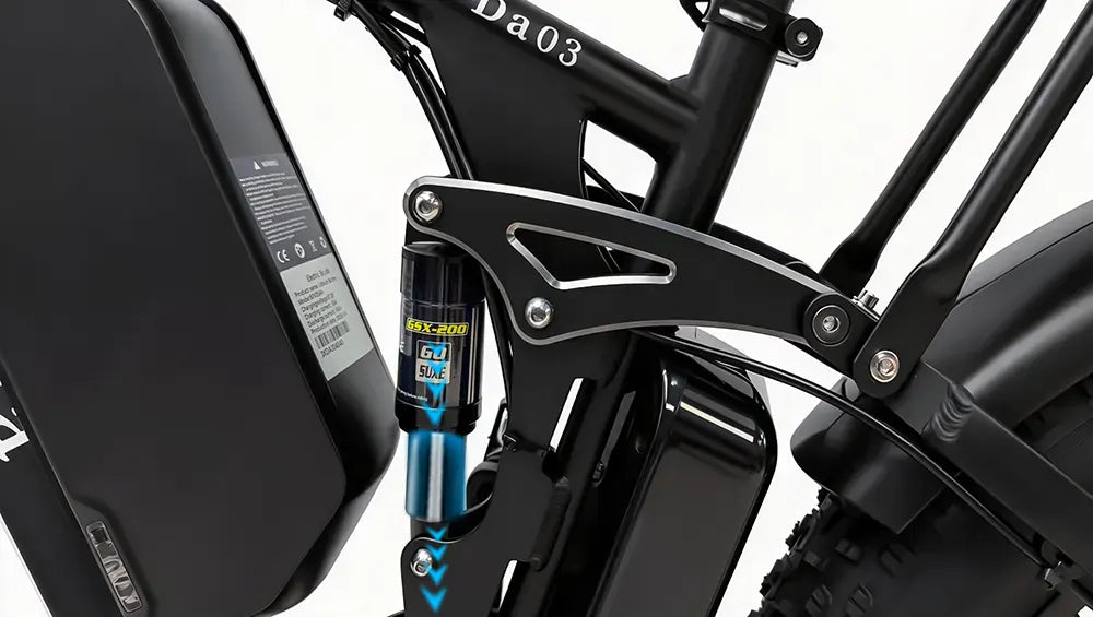 The DA03 features a dual-suspension setup with a 120mm oil-spring front fork and a dedicated 6.5-inch center shock absorber. Unlike standard rear-only suspension e-bikes, the center shock improves balance, reduces frame stress, and provides consistent comfort even with heavy loads, making it ideal for rough terrain and long-distance rides.